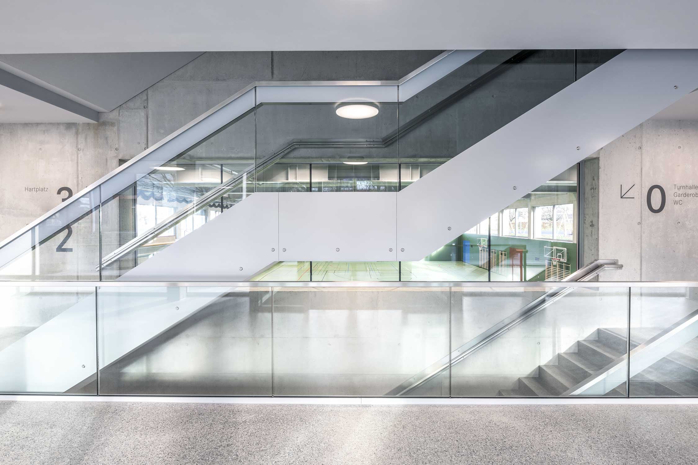 Innenaufnahme Treppenaufgang Sporthalle Kantonsschule Zug Architekturfotografie Regine Giesecke