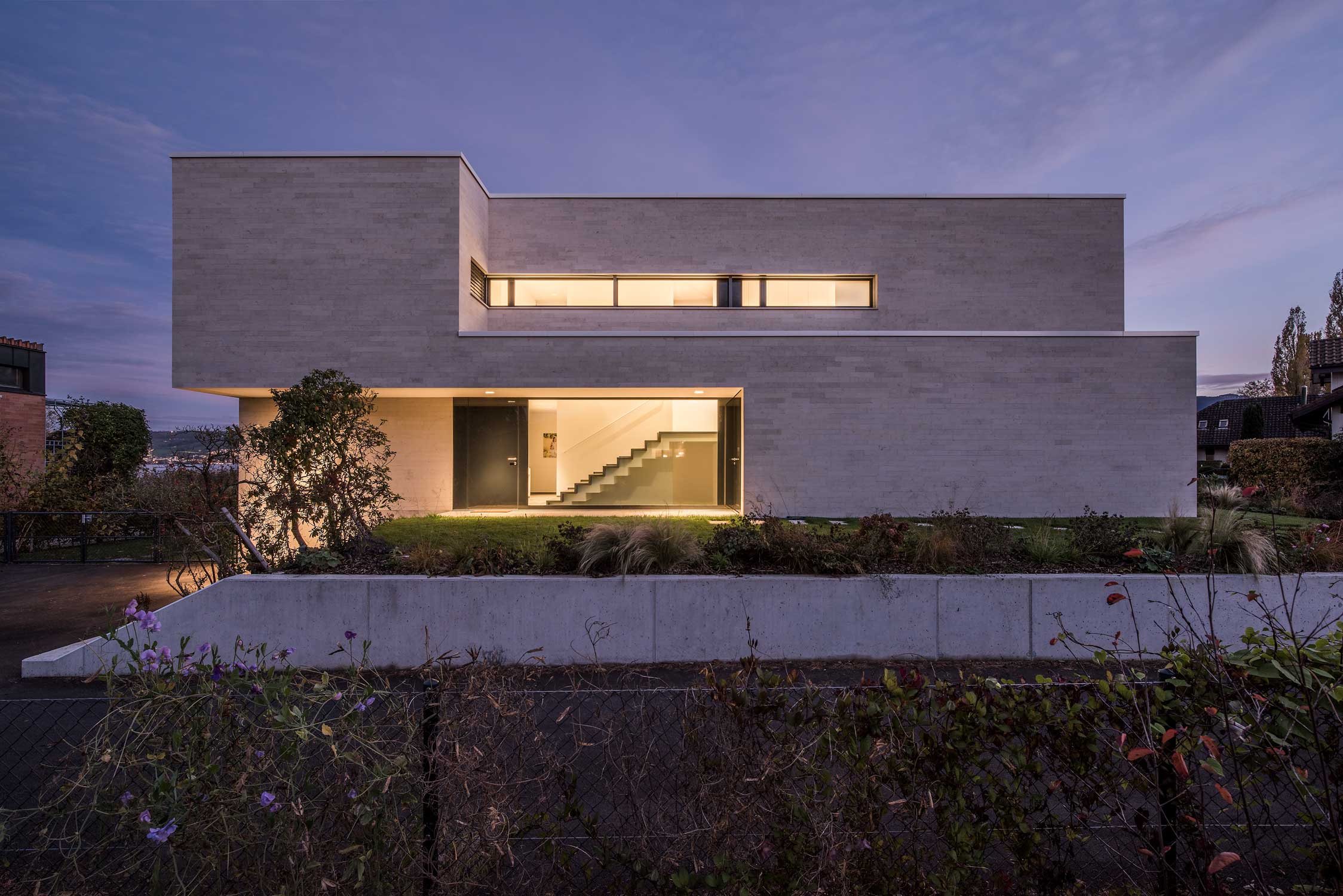 Die gosszügige Villa am Zugersee im Bauhaus Stil zeigt sich zur Strasse hin eher geschlossen. Zur Seeseite hin öffnet sich die Fassade mit grossen Fensterfronten, die eine Sonderanfertigung von „Sky-Frame Fenster“ sind. Sie gehen randlos von der Decke bis zum Boden.
