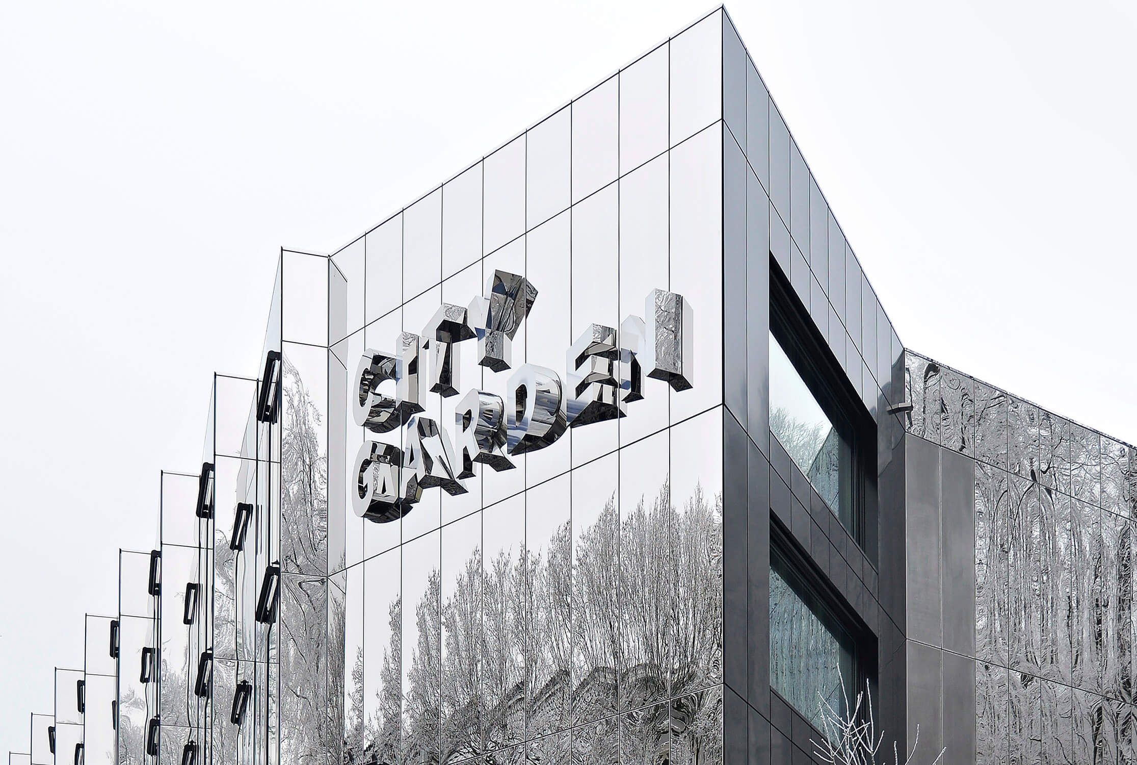 Die polierte Chromstahlfassade spiegelt den umgebenden Waldrand und verschmilzt mit ihr zu einem reizvollen Spiel aus Spiegelungen und Realem. Ein frostiger Wintertag passte von der Farbigkeit perfekt zu den Farben des Gebäudes.