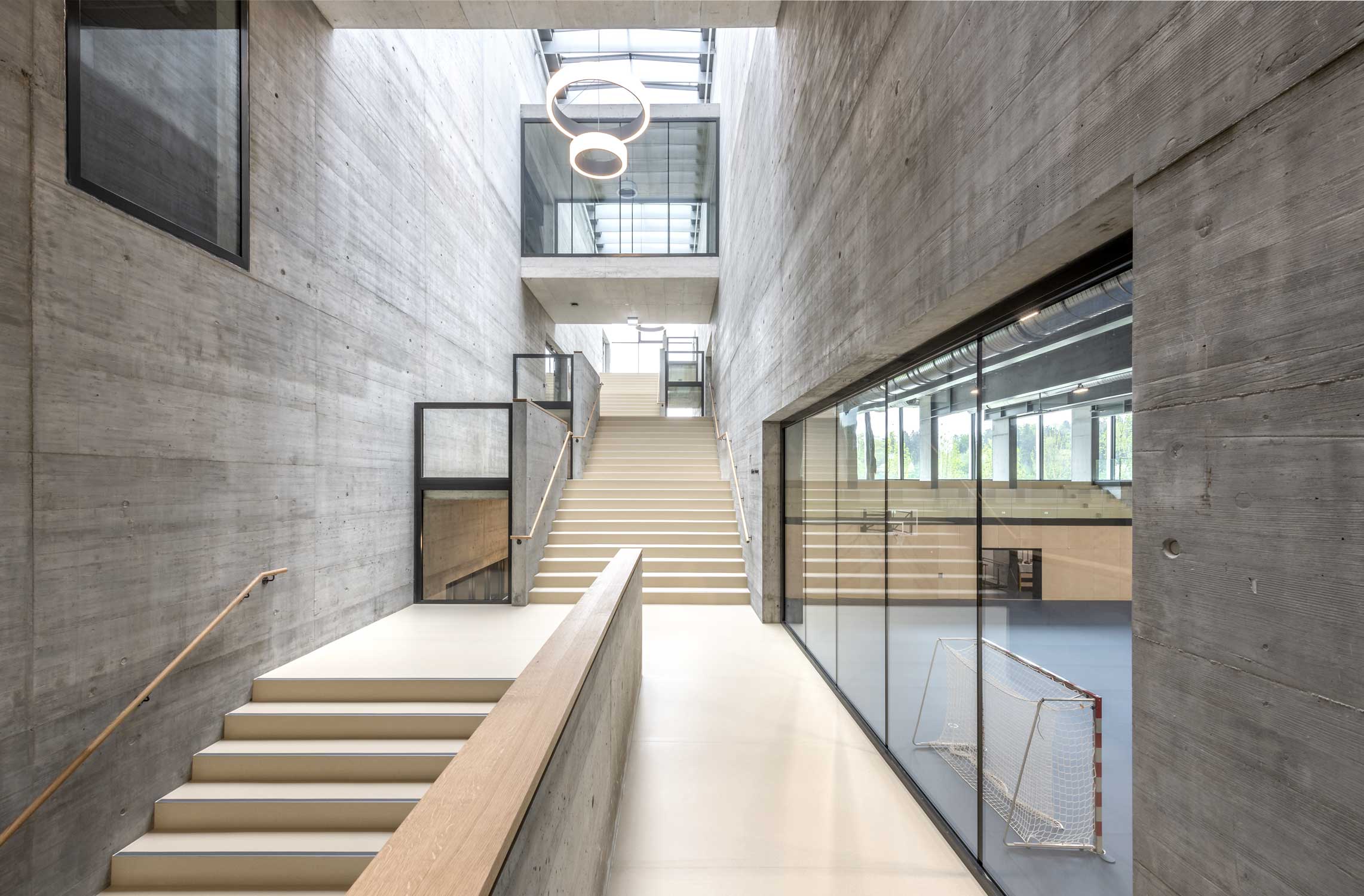 Treppenhäuser: Drei kunstvoll ineinander verwobene grosszügige Treppenhäuser leiten die Besucher und Athleten gezielt zu ihren Bereichen. Hier ist roher Sichtbeton kombiniert mit Glas und spannenden Durchblicken.